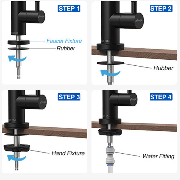 - ✔SCHRITT 3 Einsetzen und Festziehen der Handbefestigung. Vergewissern Sie sich, dass der Wasserhahn gut befestigt ist.